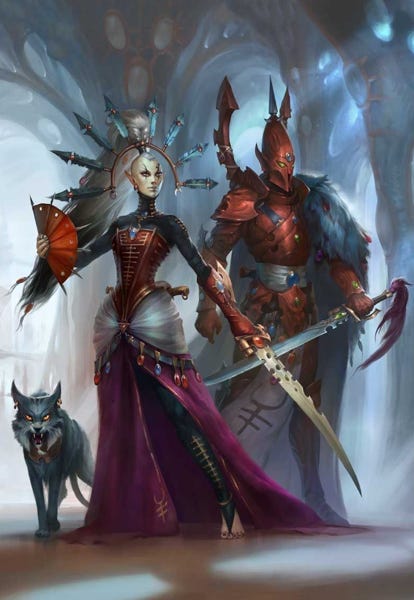 • Les Drukhari, exilés dans la Toile, qui survivent en infligeant douleur et souffrance à autrui pour éviter d’être dévorés par Slaanesh.